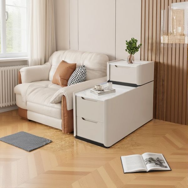 Mobile Sofa Side Table with Drawers, Marble-Effect Tempered Glass Top, Charging Ports, Rolling - 31"L x 20"W x 24"H