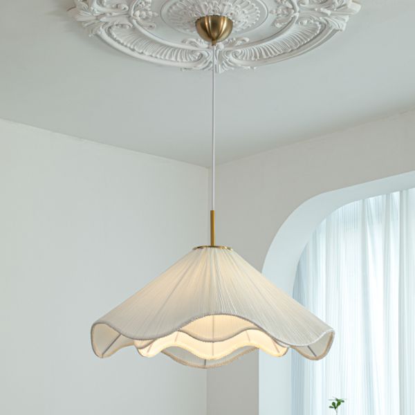 Vintage-Inspired Pleated Fabric Pendant Light, Cream Scalloped Shade Hanging Lamp with Brass Accents - 110V-120V 16"