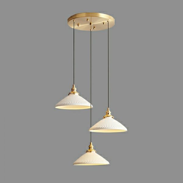 Suspension en céramique style ferme vintage, abat-jour plissé blanc, avec accents en laiton - 110 V-120 V 3 Rond
