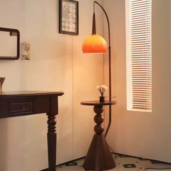 Mid-Century Arc Floor Lamp with Integrated Walnut Side Table & Scalloped Fabric Shade - Glass 110V-120V