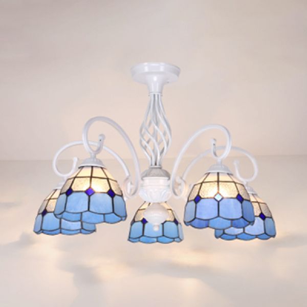 Mediterranean Bowl Flushmount Lighting 5 Bulbs Blue and Clear Glass Semi Flush Mount with Metal Curving Arm