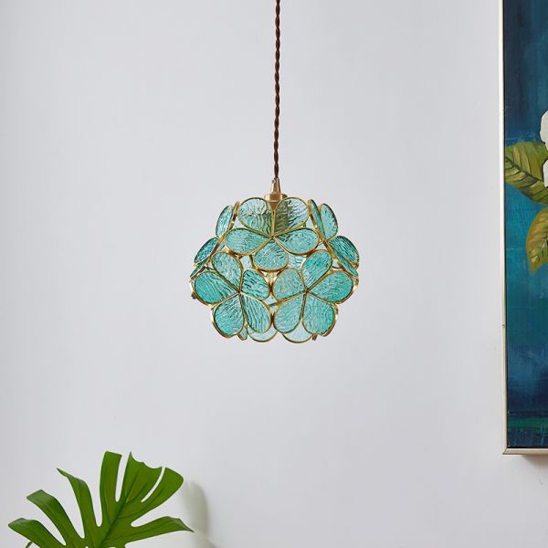 Nordic Floral Brass Pendant Light with Handmade Water Ripple Glass Shade - Blue 110V-120V