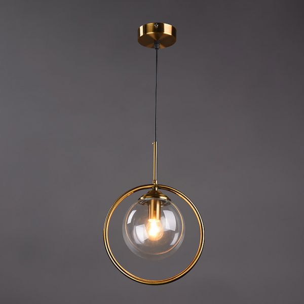 Mid-Century Luxe Glass Globe Pendant Light, Brushed Brass Halo Fixture for Kitchen Island Dining Room - 110V-120V 1 Round Clear