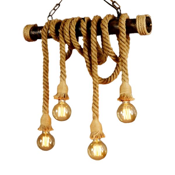 Industrial Rustic Rope Chandelier, Linear Metal Pipe Pendant Light for Kitchen Island - 110V-120V 4