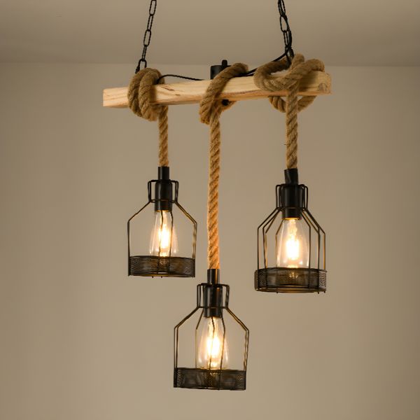 Rustic Industrial Wood Beam Linear Chandelier with Hemp Rope Accents and Metal Cages - 110V-120V 3