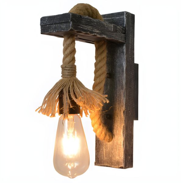 Rustic Industrial Hemp Rope Wall Sconce, Distressed Wood Farmhouse Fixture - Grey 110V-120V