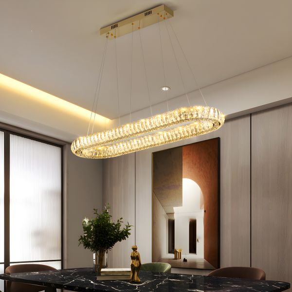 Luxe Crystal Oval Island Chandelier, Linear Gold Pendant Light with Faceted K9 Accents and Integrated LED, Adjustable Suspension for Dining Room