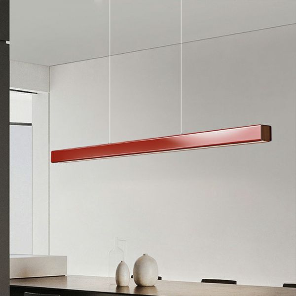 Minimalist Linear LED Island Light, Slim Red Suspension Bar Chandelier with Wood Accents for Dining Room