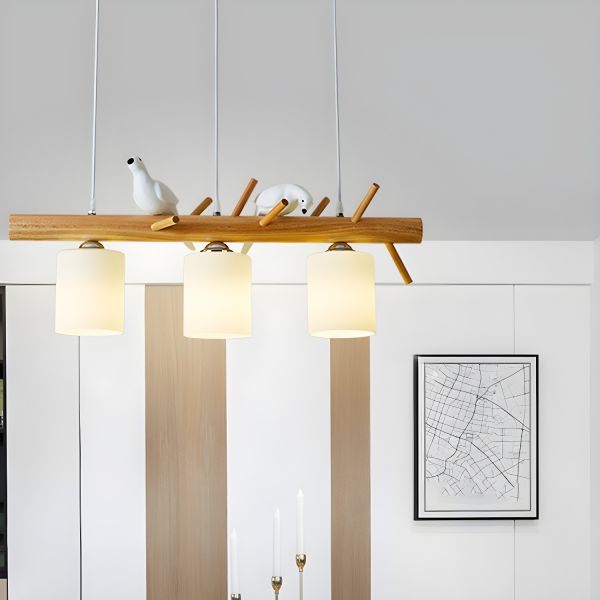 Nordic Wooden Linear Pendant Light, Nature Inspired Island Chandelier with Bird Accents and Glass Shades