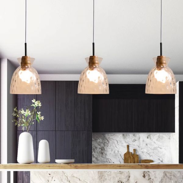 Scandinavian Wood Island Pendant Light, Hammered Glass Shade for Kitchen Island