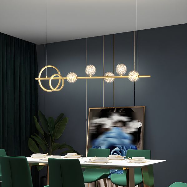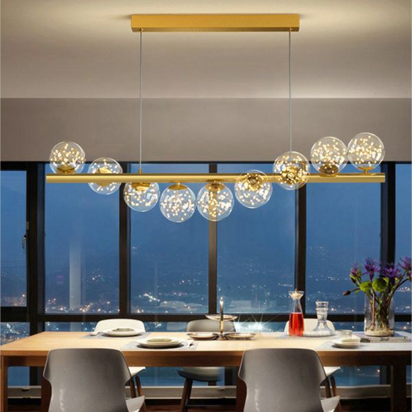 Modern Linear LED Chandelier Gold Island Pendant Light with Starry Glass Globes for Dining Room