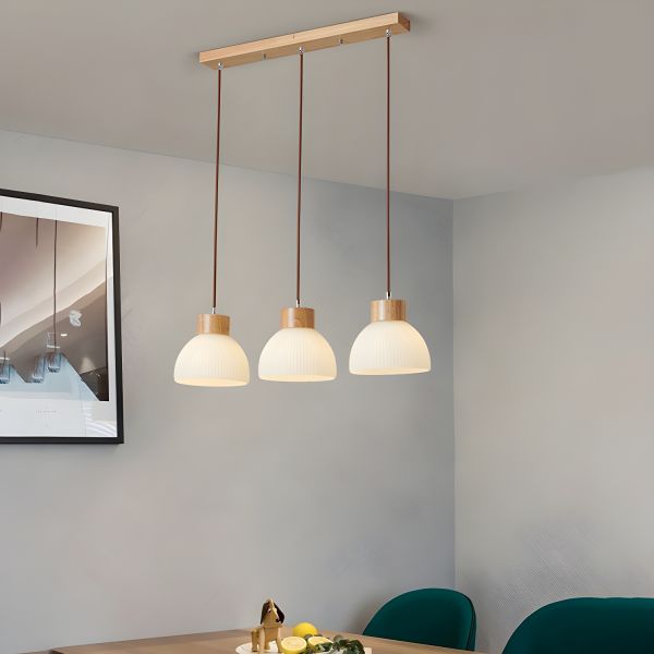 Scandinavian 3-Light Island Pendant Lights, Solid Wood & Fluted Glass Island Fixture with Adjustable Height