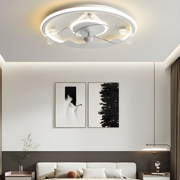 Children's PMMA Retractable Blade Ceiling Fan with 4 Glassy Blades, Flushmount, Third Gear Color Temperature, and LED Light, White, 110V-120V, 35.5"