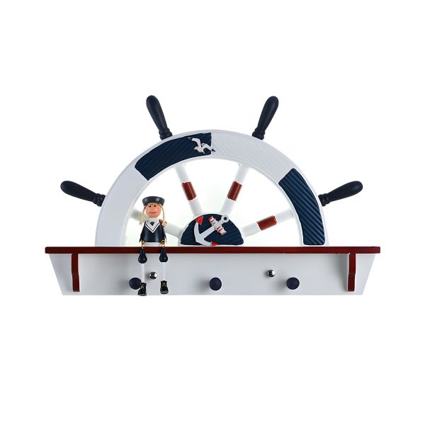 Coastal Wooden Helm Wall Sconce with Storage Shelf & Coat Hooks - 110V-120V Rudder White Light