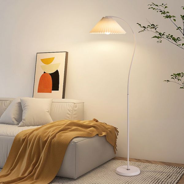 Scandinavian Pleated Fabric Arc Floor Lamp, Tall Curved Standing Light with Weighted Base for Living Room Reading Corner