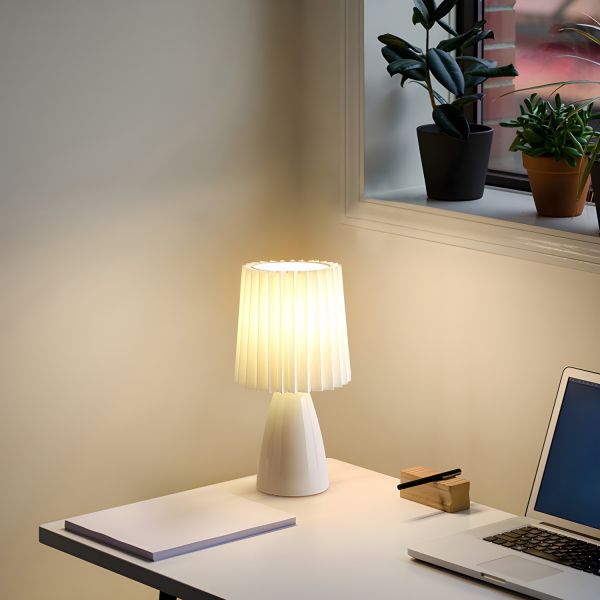 Mid-Century Pleated Ceramic Table Lamp, Small Bedside Nightstand Light with Glossy Base
