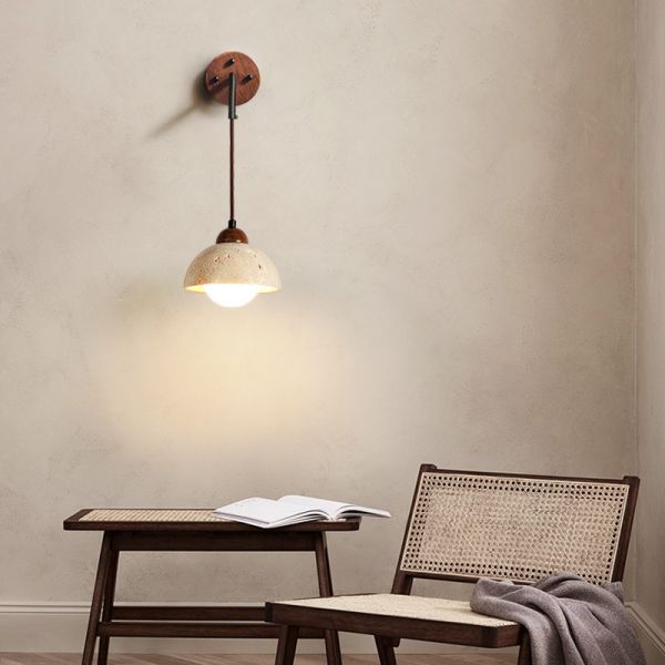 Japandi Travertine Drop Wall Sconce, Organic Stone & Wood Fixture for Ambient Bedroom Lighting - Dome 110V-120V Brown