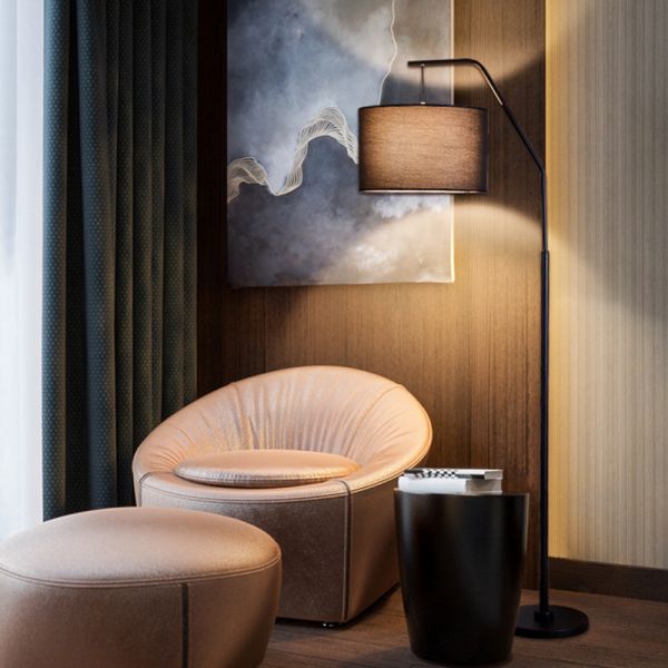 Contemporary Arched Floor Lamp with Textured Fabric Shade and Weighted Metal Base - 110V-120V Fixed Height Black