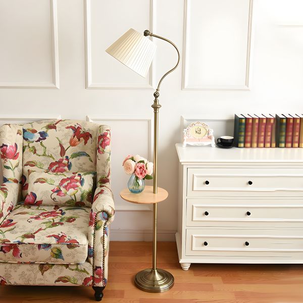 Vintage Floor Lamp with Built-in Wood Tray Table, Adjustable Brass Standing Light with Pleated Shade - 110V-120V Beige