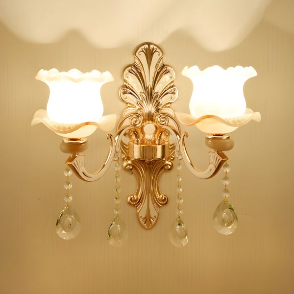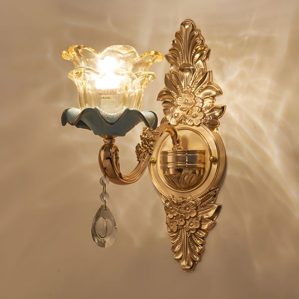 French Vintage Wall Sconce, Gold Wall Lamp with Floral Glass Shade and Crystal Accents - Gold 110V-120V 1 G