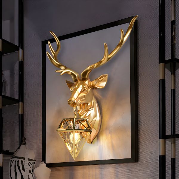 14.5" W 1 Bulb Wall Mounted Light Rustic Geometric Elk Head Resin Sconce Lamp in Gold with Diamond Cage Shade
