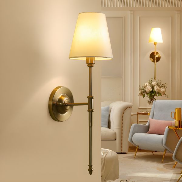 Transitional Brushed Brass Wall Sconce with Tapered Fabric Shade and Slender Vertical Stem - 110V-120V