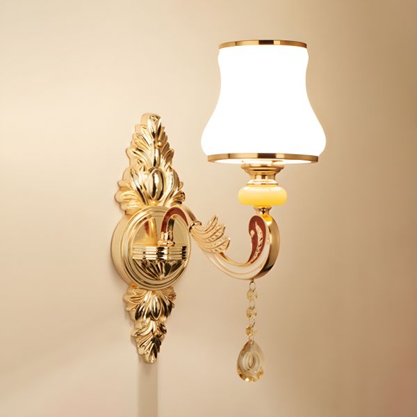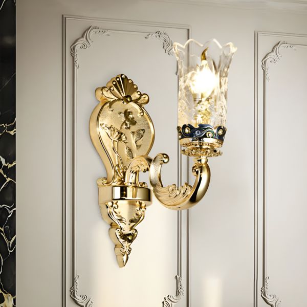 French Baroque Gold Wall Sconce, Vintage Floral Glass Shade with Crystal Accents, Ornate Fixture for Hallway or Bedroom - 110V-120V Gold 1 A