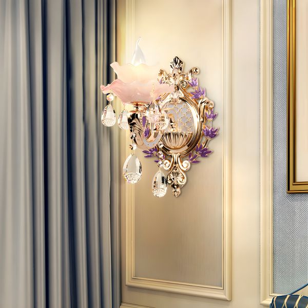 French Baroque Gold Wall Sconce with Crystal Drops & Floral Shade - 110V-120V Gold 1