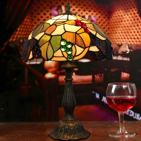 Vintage Stained Glass Table Lamp, Grape Vine Pattern with Antique Finish Base - 110V-120V Antique Brass