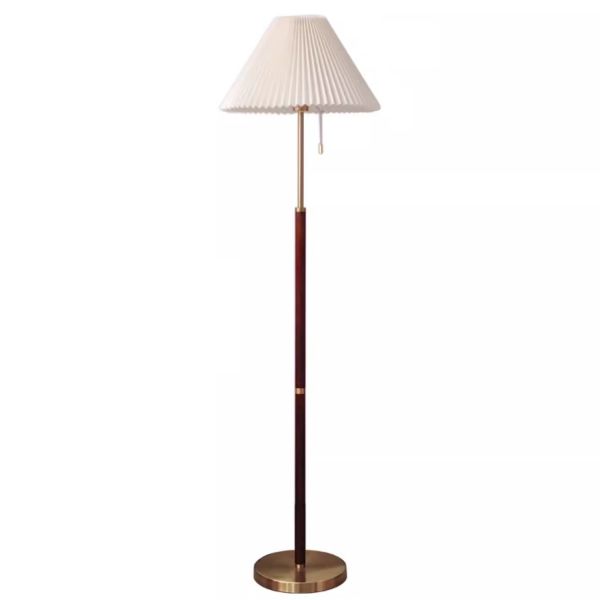 Mid-Century Walnut Wood Floor Lamp with Pleated Fabric Shade - Vintage Standing Light with Brass Base and Pull Chain Switch - 110V-120V