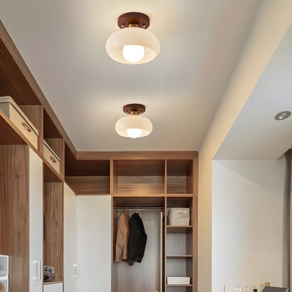 Japandi Solid Wood Flush Mount Ceiling Light, Cream Glass Mushroom Shade with Brass Accents, Minimalist Fixture for Hallway, Bedroom, or Entryway - Drum Walnut 110V-120V