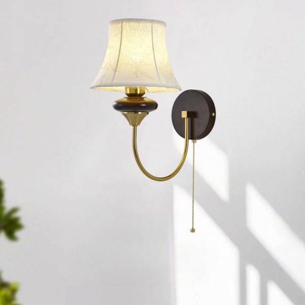 Mid-Century Walnut Wall Sconce with Pull Chain Switch and Textured Fabric Shade for Bedroom - 110V-120V With Shade