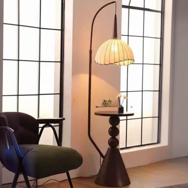 Mid-Century Arc Floor Lamp with Integrated Walnut Side Table & Scalloped Fabric Shade - Fabric 110V-120V
