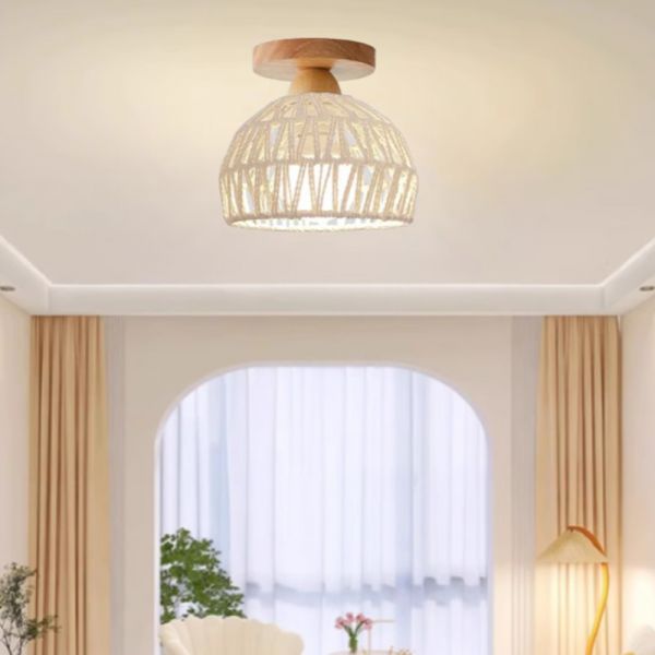 Bohemian Rattan & Wood Semi-Flush Ceiling Light, Natural Woven Rattan Lamp for Hallways & Bedrooms - 110V-120V 7"