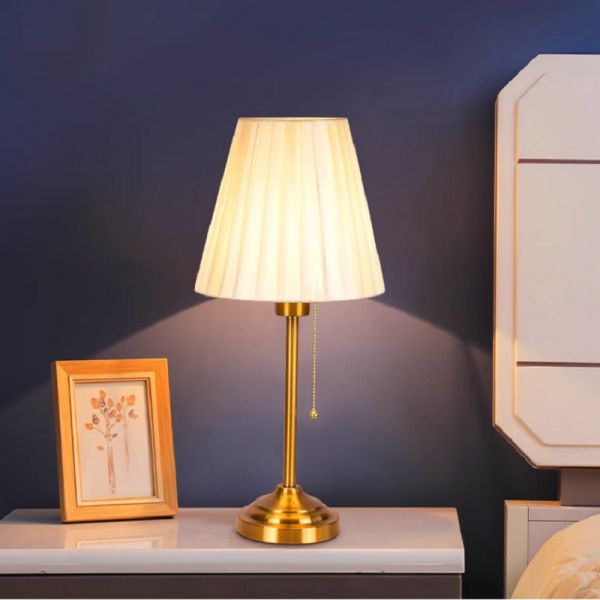 Vintage Brass Bedside Table Lamp with Pleated Fabric Shade and Pull Chain Switch - 110V-120V Beige