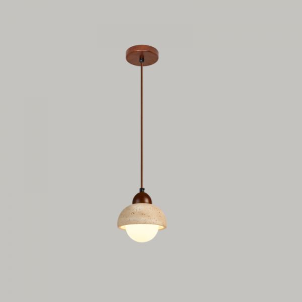 Japandi Travertine Stone Pendant Light, Organic Hanging Lamp with Walnut Accent for Dining Room - 110V-120V 6"