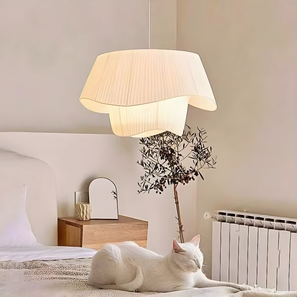 Japandi Pleated Fabric Pendant Light, Wavy Organic Hanging Lamp for Dining Room Bedroom - Beige 19.5" 110V-120V