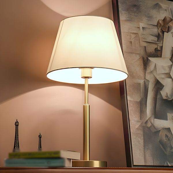 Contemporary Brass Table Lamp with Linen Shade, Minimalist Bedside Nightstand Light - 110V-120V 12"