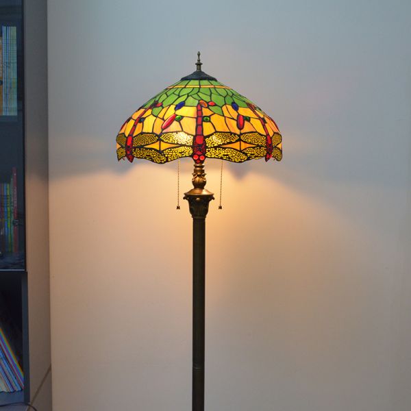Vintage Tiffany-Style Stained Glass Floor Lamp with Dual Pull Chains and Antique Bronze Base - 110V-120V Army Green