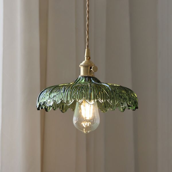 Vintage Floral Scalloped Glass Pendant Light with Brass Socket and Twisted Fabric Cord - Green 110V-120V