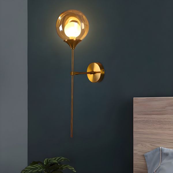 Mid-Century Brass Globe Wall Sconce, Tinted Glass Vanity Light for Bedroom or Hallway - 110V-120V Amber Globe