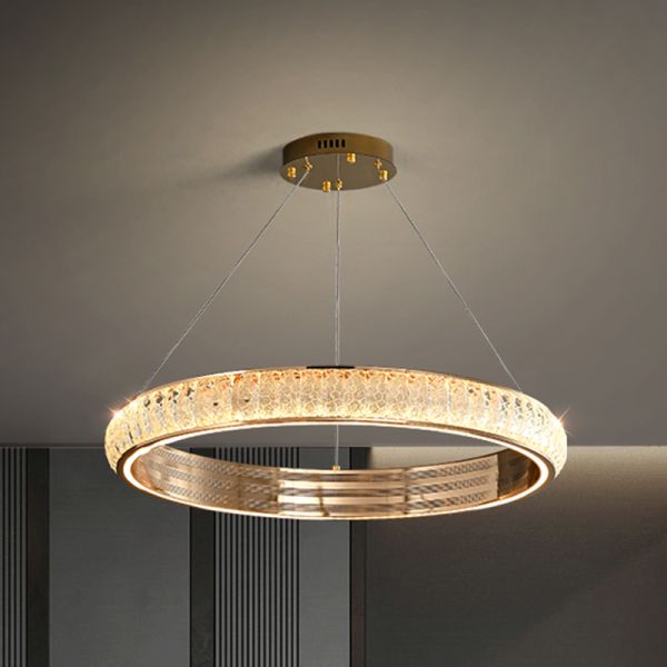 Luxe Contemporary LED Chandelier Gold Ring Pendant Light with Textured Crystal Accent & Adjustable Hanging Height - 110V-120V 24"