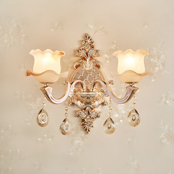 French Baroque Gold Wall Sconce, Vintage Floral Glass Shade with Crystal Accents, Ornate Fixture for Hallway or Bedroom - 110V-120V Gold 2 A