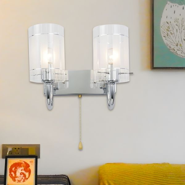 Cylinder Dining Room Wall Lamp Warehouse Clear Glass 2-Head Chrome Sconce Light with Pull Chain