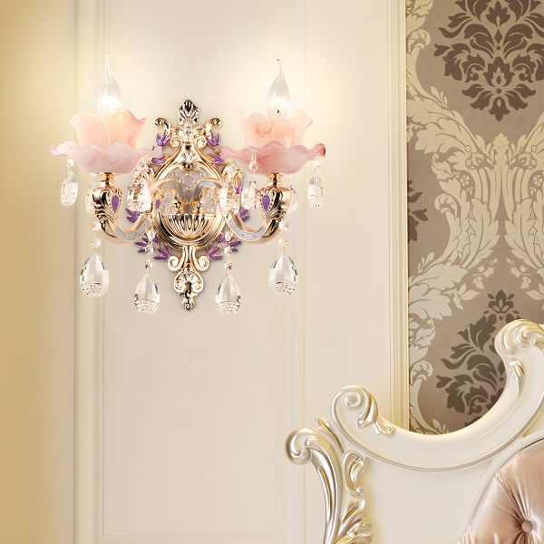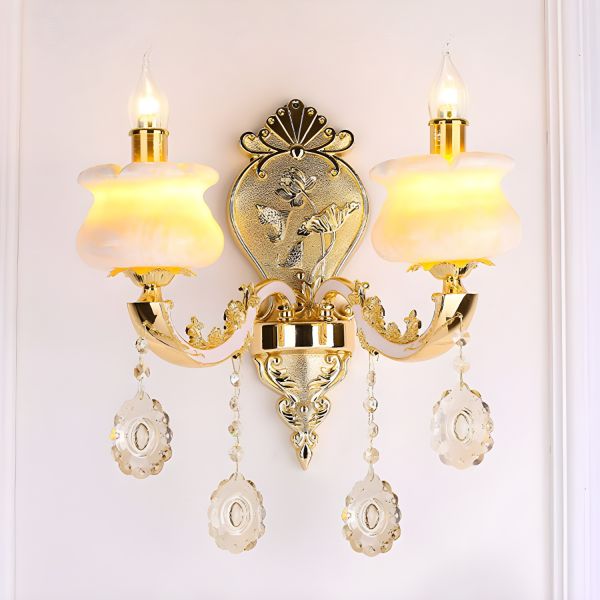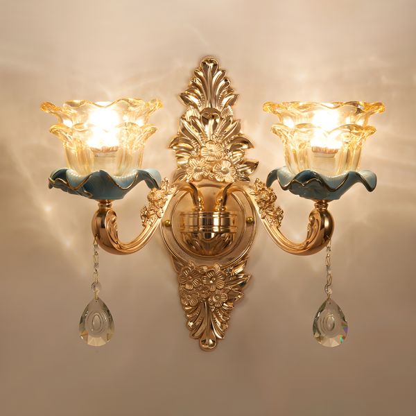 French Vintage Wall Sconce, Gold Wall Lamp with Floral Glass Shade and Crystal Accents - Gold 110V-120V 2 G
