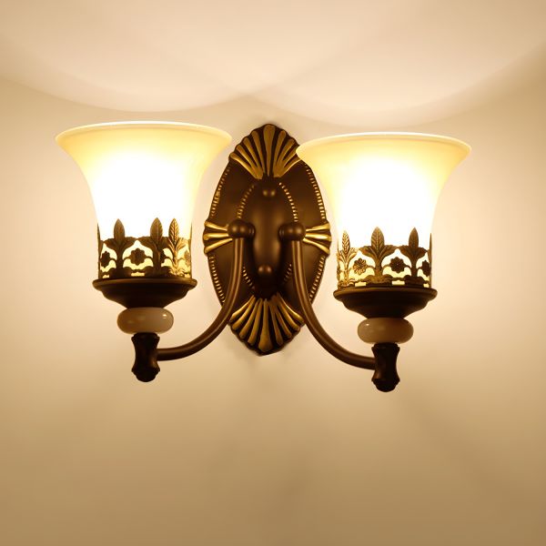 Antique Flared Wall Mounted Lamp 2-Light Opal White Glass Wall Lighting in Brass with Curvy Arm