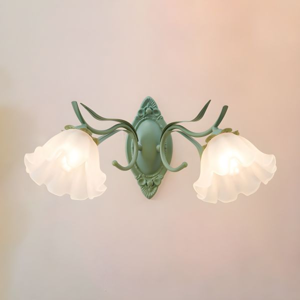 French Country Floral Wall Sconce, Sage Green Metal Fixture with Frosted Glass Flower Shades - 2 110V-120V