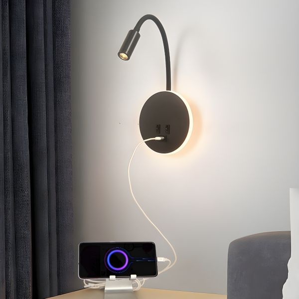 Scandinavian LED Wall Sconce with Adjustable Gooseneck and Ambient Backlight Halo - 110V-120V Black Round USB Port Included