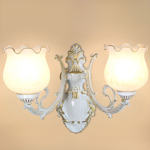 Vintage Victorian Wall Sconce, Ornate Scroll Metal Fixture with Frosted Glass Flower Shade - 2 110V-120V White/Gold