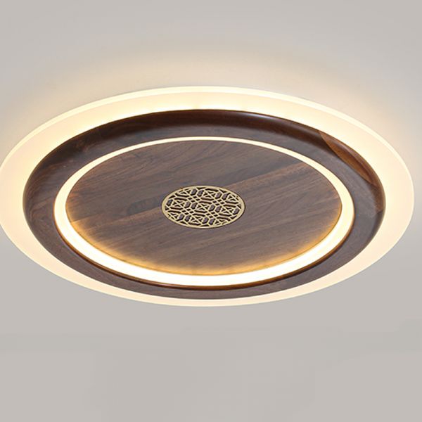 Zen Wooden Flush Mount Ceiling Light LED Fixture with Brass Lattice Detail - 110V-120V 16" Round Natural Light